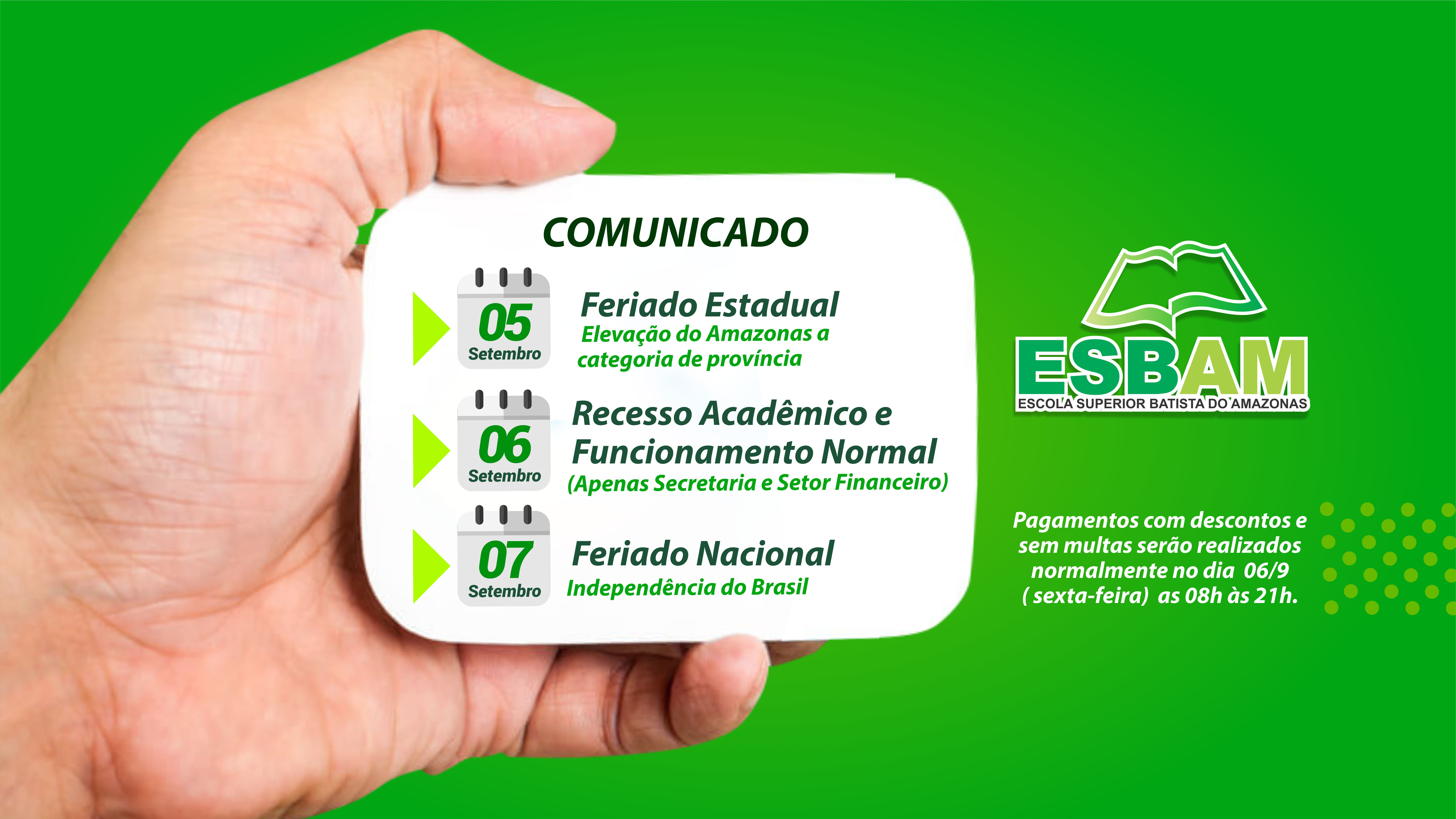A Escola Superior Batista do Amazonas (ESBAM), informa que nos dias 05 e 07 de Setembro entrará em recesso acadêmico e administrativo em virtude do feriado. Portanto, os pagamentos referentes às mensalidades poderão ser pagos normalmente com descontos e sem multas no dia 06/9 (sexta-feira), das 08h às 21h, no setor financeiro da Instituição.