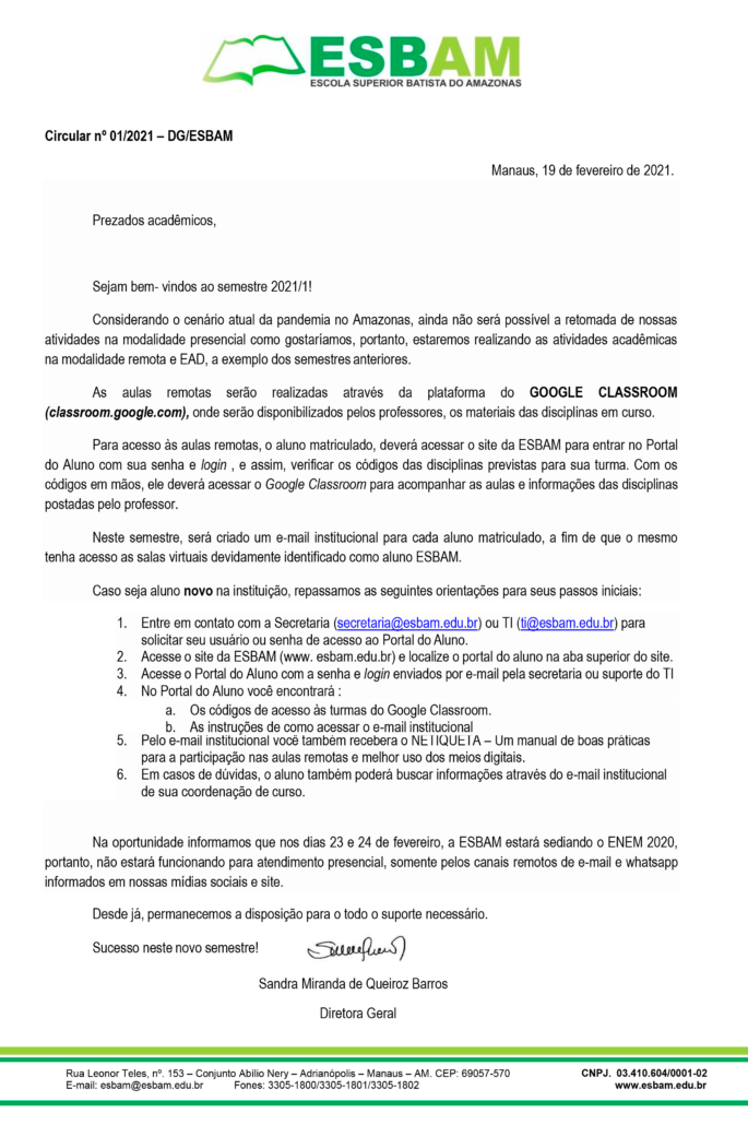 Circular nº 01/2021 – DG/ESBAM
